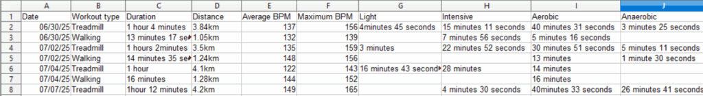Date, Workout type, Duration, Distance, Average BPM, Maximum BPM.