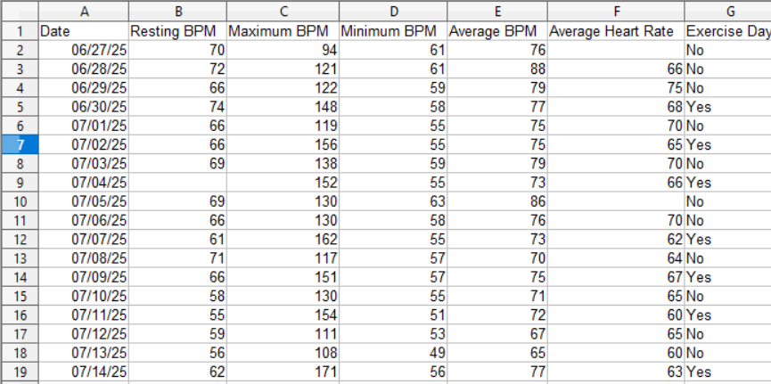 Next, from the Mi Fitness heart rate, gather all days, add additional field such as if its a work out day or not a workout day.